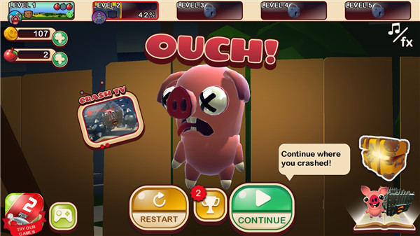 5、应对单一种类的机关说实话并没有什么难度,游戏前期我过得相当清闲,但等到了后期,关卡中的轨道会掺杂多种类型机关并且一个紧挨着一个,点击屏幕之后所有的机关都会有所触动,因此当小猪通过了某一个机关之后要尽快将后续的机关恢复原样,也就是说它考验的果然还是手速和反应力。