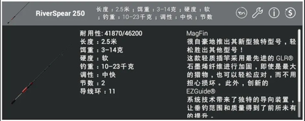 RiverSpear 250 这把杆子是一把伴随蒙古地图出的新杆子,它的出现弥补了以往缺少小饵钓大鱼的杆子的缺陷,适合使用10g以内的假饵,拥有良好的抛投距离和钓重