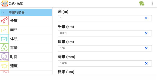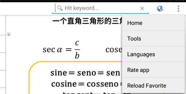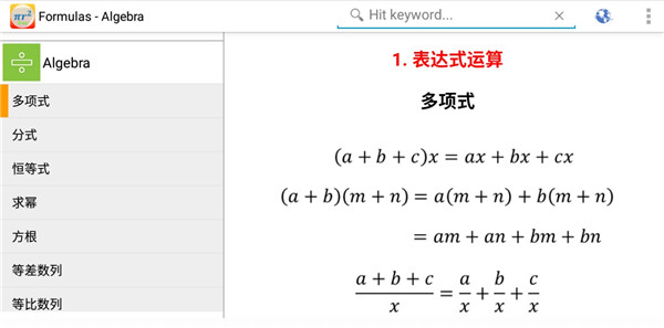 该软件的使用方法也非常的简单,用户点击软件左上角,就可以切换我们需要的公式内容。该软件由众多语言可供用户选择,完美的提供了所有基本的数学公式,这对所有高中或大学学生和工程师寻找任何简单或复杂的公式是非常方便的,并且这款软件十分简洁,客户端十分轻量化,没有任何广告,内购和付费内容,非常适合学生或者工程师使用。