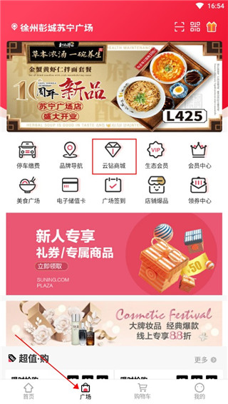 1、下载好app后,点击进入,在【广场】板块,选择【云钻商城】。