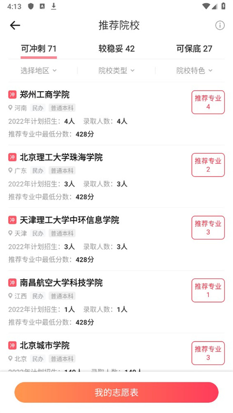 在推荐院校的基础上,考生可结合自己的意向城市地理位置、学校类型、意向专业等情况进一步生成自己的专属志愿。