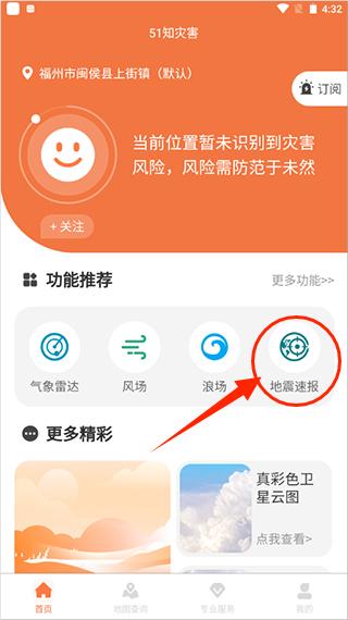 1、下载并打开51知灾害灾情预警app,来到主界面点击“地震速报”。