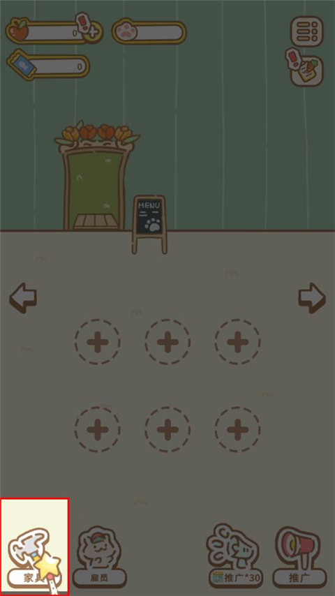 1、玩家在进入游戏之后,店里面什么都没有,需要先购买一些家具。