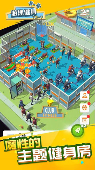 游泳健身了解一下(Idle Gym)是一款非常魔性的放置经营类游戏,核心玩法非常简单,10分钟内玩家可以了解所有的规则。玩家经营一家健身房,首先需要购买器械,然后通过设备升级、用户锻炼速度提升和健身价格三项标准,来提升健身房的综合运营能力。通过主动点击顾客可以加速健身,提升健身房的营业效率。