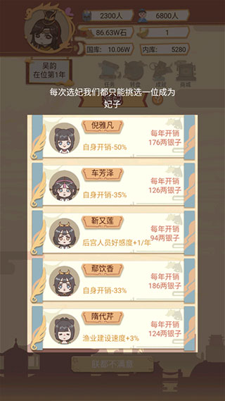 5、还可以进行选妃,每次选妃我们都只能挑选一位成为妃子,其他没有选中的也会进入皇宫哦。