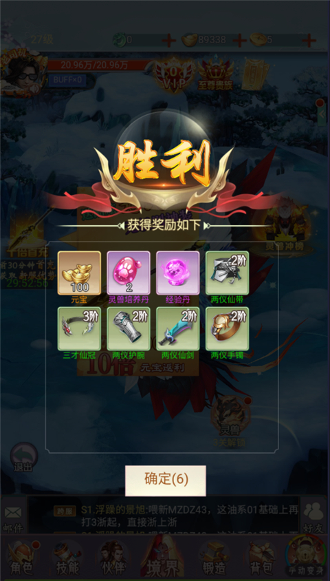 4、击败boss后考验获得闯关资源、装备奖励