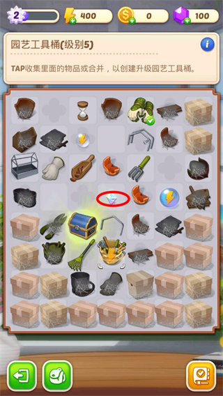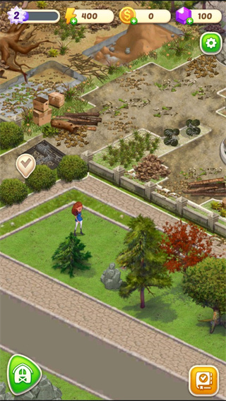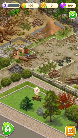 1、首先大家打开游戏可以看到庄园很乱,所以我们要开始整理,点击中间打钩的按钮。