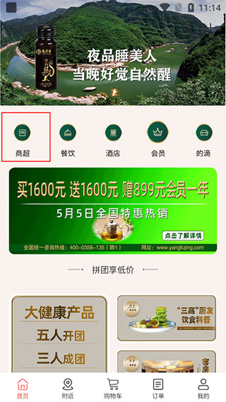 1、多种首页服务专区,上面设置了商超、外卖、酒店以及会员服务专区