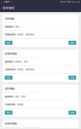 2、分为顶栏模板、标签栏模板、底栏模板、纯底栏模板、空白模板。这里选择了顶栏模板(看自己需求)。输入应用名,点击创建。