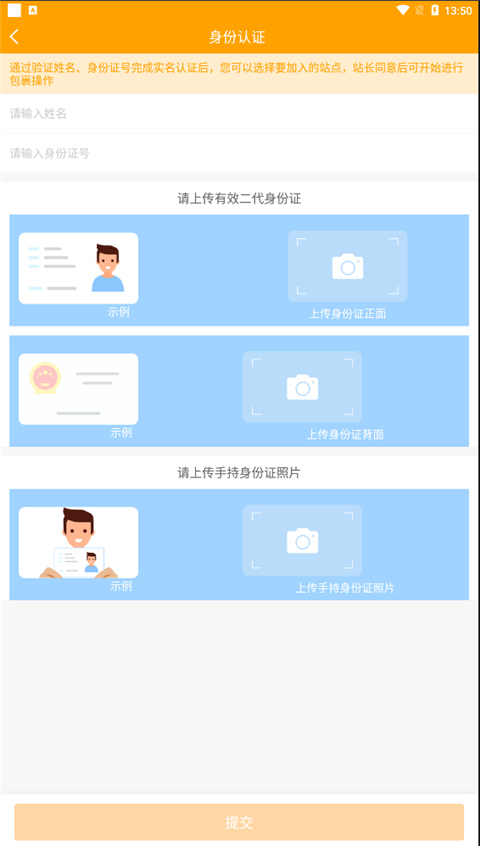 3、登录注册APP,提交实名认证信息,通过后可配置接单站点。