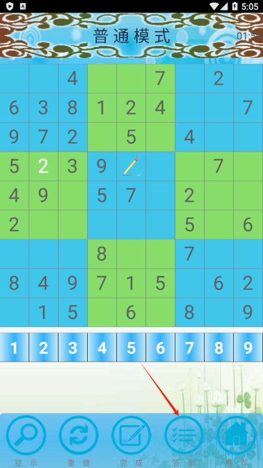 4、玩家还可点击右下角的【答案】按钮,这时候会显示数独的正确答案并全部填入。