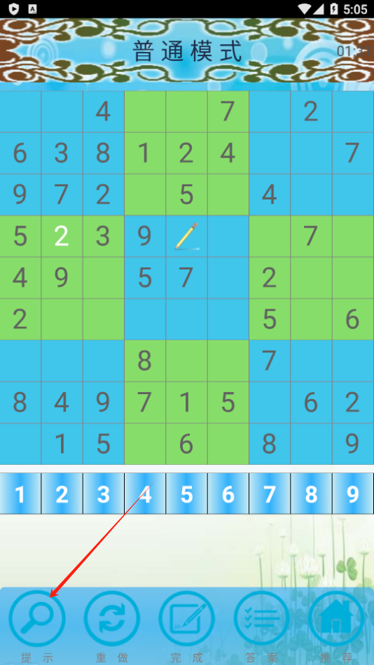 3、如果玩家不太确定格子里应该填什么数字,可以直接点击左下角的【提示】按钮,游戏会自动生成正确数字填入铅笔处。