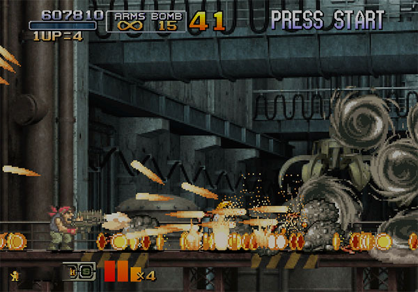 此场景出现的橄榄不会像前面的发射3段攻击,而是发射超大的橄榄弹,但是轨迹都是通过跑步可以躲过的(后面会出现一个轨迹不能通过跑步通过的橄榄)。当摧毁第二个橄榄后,会出现一名新的敌人:3只巨大的独眼鱼怪,它会向天空发射降落伞导弹(可以击毁),还会把你逼死在版面左边,所以要快速击毁(只有眼睛是弱点)。第一只是单枪匹马出现的,第二只还伴随3只ET,第三只伴随9只ET(打暴ET注意地上的自暴虫)。走到倒数第二层会出现前面提到的一个轨迹不能通过跑步通过的橄榄,它发射子弹后,要跳到此处的台阶上看准时机跳过,建议最好快速解决,否则援军飞碟会将上面的一个人质释放,此人质一但着地就救不到了。此场景有4块地方有隐藏的骨头,分别位于打完大独眼怪后版面上移后最右侧平台上方,第二次版面上移后人质上方和第三次版面上移后的人质上方。全部打出三个隐藏点才能打第四个隐藏点——在最后一次版面上移后立即左跳出大S,或者在最后一次版面上移后立即左移下降到最左边,然后稍微右移往左跳并出大R可击中隐藏点掉出骨头(当然一般吃不到),打出全部四个隐藏点后在最后一个机器人处会出现给Bullet的人质。进入小boss战,在类似光头将军的战场上对决洗脑同伴(因为多次失败,光头下岗了),此boss的攻击方式和你一样,出刀比3代的复制人快很多,但还算好对付,但此boss的难度是他的机枪,跳起发射6向机枪,暴走后还会发射多发机枪,很难躲;RP差的时候还会近身发射机枪。建议攒大S或Z然后得到Bullet加弹药后迅速消灭。这时。解救洗脑同伴后会出现金色的METAL SLUG(如果长时间不乘坐,在下层会出现500000的奖分,并且强制过关)。