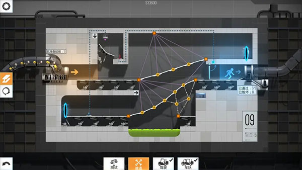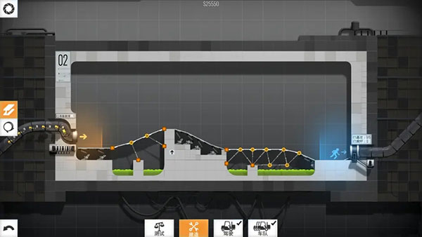 斜坡。这一关用到了三角形稳定结构,先铺设上一层桥面,然后点击桥面进行硬化,在桥面的下方,搭设三角形结构进行支撑,即可通关。