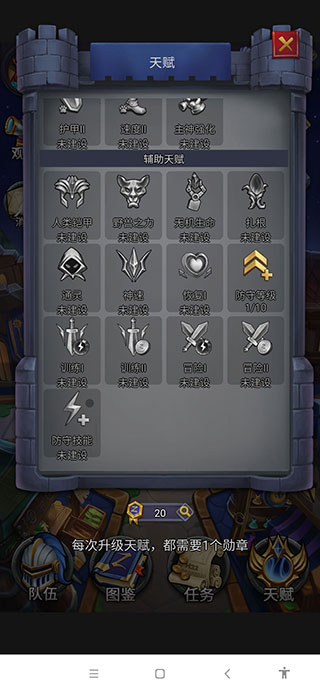 4、天赋:这个是用于提升各个英雄的属性,和一些特殊效果的,具体的话,需要看各个天赋的用处,这个比较耗金币,量力而行,这个你需要足够的金币和徽章。