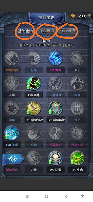 2、图鉴:是我们的核心关键,里面包括了我们使用的技能和法术,宠物等,图鉴的话是可以升级的,你升级图鉴在冒险中和建城里会增加相应的等级,法术和技能的图鉴等级最高为5级,宠物为10级。我们的图鉴分为基础,海洋,地底三种不同的,基础的没有开也能用,海底和地底的需要开到升级解锁才会在培养队伍中遇到。