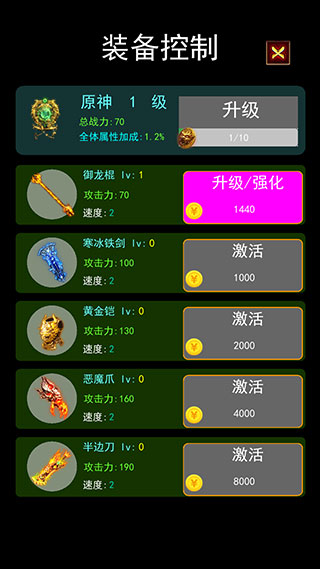 6、点击背包右侧的装备按钮,可以打开装备控制界面,玩家可以在此对装备进行升级强化等操作。