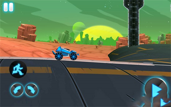 1、进入变身汽车侠后,我们将控制一个看起来很像玩具车的车辆前行,点击右边有点像“播放”的按钮就可以向右前行了,屏幕左下角有两个箭头按钮,分别控制车辆中心前倾或者后仰,玩家们可以用它们来适当的控制车辆前行状态。