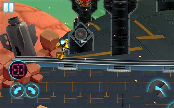 4、这里要注意一下,当我们变身机器人的时候,攻击按钮周围会有一圈蓝色能量条,当能量条续满的时候,机器人形态就会自动变回车辆形态。