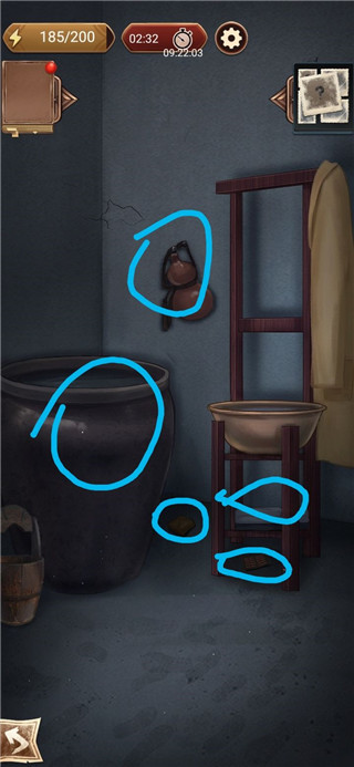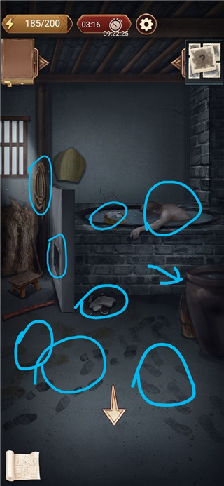 一捆麻绳,黄酒,灶中余烬,布鞋,布鞋脚印,皮鞋脚印,奇怪的脚印,奇怪的姿势(注意这里一共有三个脚印,如果收集不全后期柴房会卡在95%,看广告都没提示,太草了)