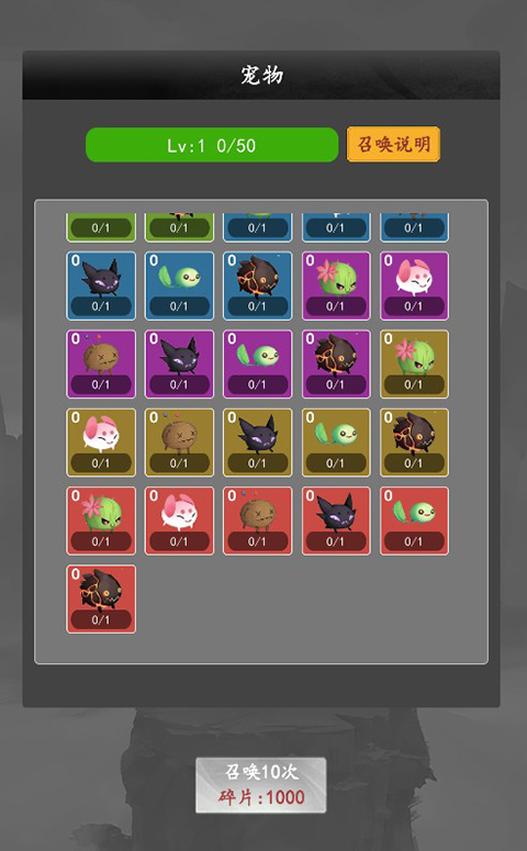 2、游戏内的宠物从低到高分为白、绿、蓝、紫、褐、红六种色阶,玩家消耗1000个碎片可以召唤宠物,帮助玩家提高属性战力。