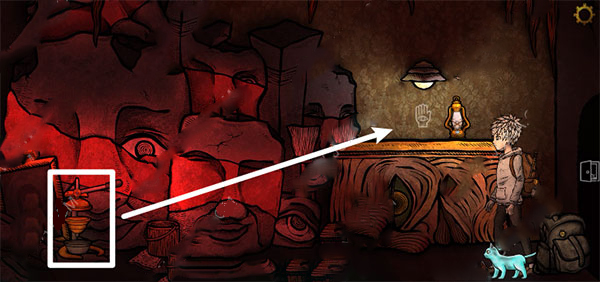 7、将玫瑰花给女人,进入嘴巴,白框处拿到一个机器,将蚕蛹放到机器里,使用机器获得绿色燃料,将燃料放入右边的灯具里,获得发光的灯