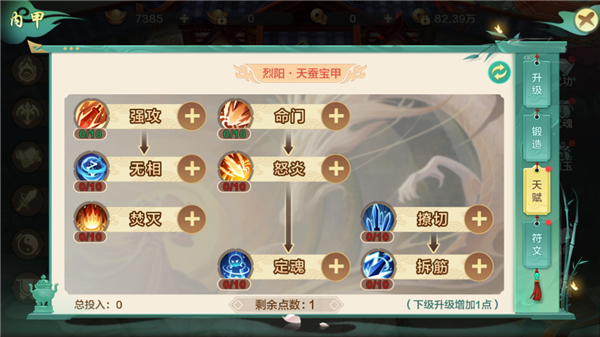 2、内甲可以进行升级、锻造、天赋投点、符文镶嵌。消耗内甲经验丹提升内甲的属性,三个内甲分支共享等级。