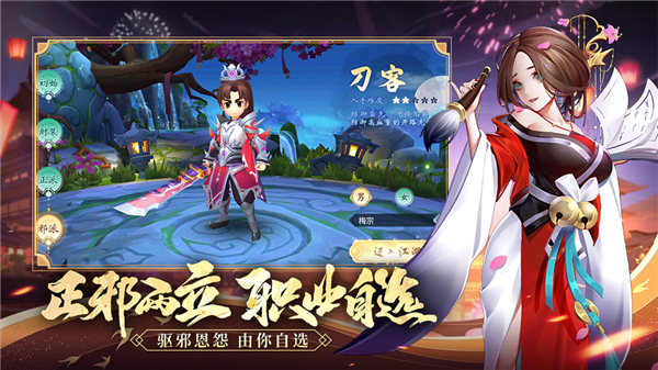 游戏中包含医师、刀客、剑士、弓手、枪客五种职业,归属于其专属门派,各分为正邪阵营,均有其自身的风格特色,技能招式多样,可通过不同套路组成花样无穷且强劲的连招,随时随刻自由转职。