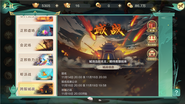 1、城战玩法是跨服的城池争夺型玩法,每周六20点开启。城池初始阶段不设立城主,3级以上的帮派可以消耗城战虎符进行报名,报名是暗标形式,出价最高的4个帮派获得参与城战的资格。