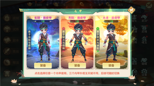 1、内甲系统在少侠等级达到60级开放,该系统分为玄印、烈阳、太虚三个分支,初始需选择一个分支,后续将可以无损切换分支。