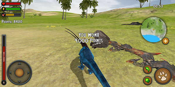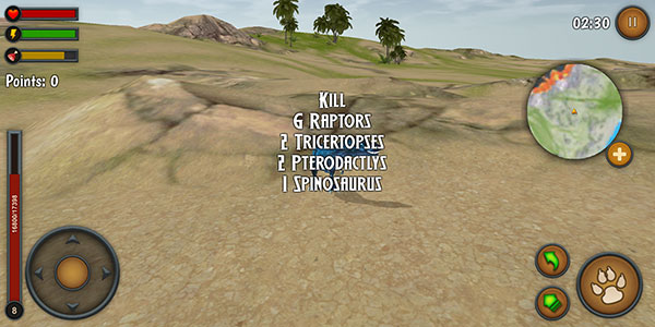 1、使用虚拟摇杆控制你的霸王龙移动,右侧的地图可以查看你周围的恐龙。