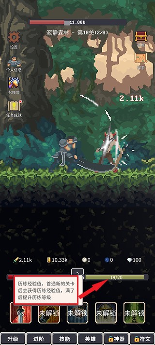 点击之旅是一款点击、放置挂机类的游戏。游戏将带玩家进入一个充满怪物的像素异世界,玩家需要不断地击败前方的怪物离开这个可怕的世界。并且游戏内也提供了多种多样的角色和技能,您可以根据自己的游戏偏好来选择并解锁这些角色和技能,而且每个角色都有其独特技能。无论玩家是喜欢近战战斗、远程攻击还是法术释放,都可以在游戏中找到合适的角色来闯关。此外,游戏还提供了丰富多彩的挑战和任务,完成这些任务可以获得大量的金币和钻石奖励,让用户可以不断提高自己的游戏技能,提高自己的战斗力。