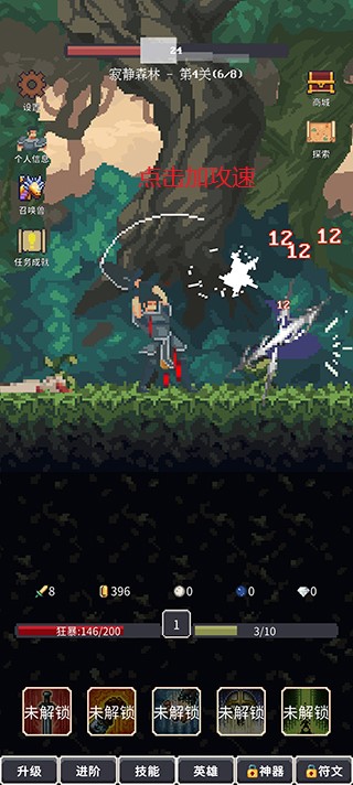 游戏角色会按照攻击速度、移动速度进行自动攻击与移动,点击屏幕可以加快攻击频率与移动速度,并且和自动攻击伤害加成是不同的,而且每次攻击可能会造成暴击。