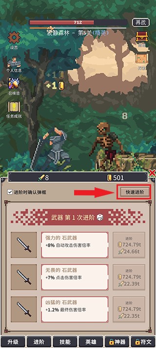 最新进阶的装备是最强力的,进阶装备会出现不同的品质,不同品阶装备需要的进阶金币、基础伤害不同。