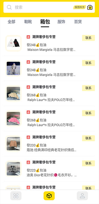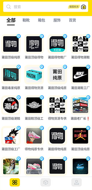 2、首页有鞋靴、箱包、服饰以及百货等资源商家,可以自由浏览,还可以在搜索框图片识别或者直接搜索商品。