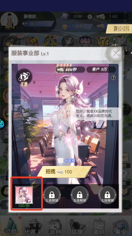 乱世神话是一款模拟经营广告公司经营卡牌养成的模拟人生挂机游戏,玩家将在游戏内成为一名广告小助理,从最底层开始做起并逐渐逆袭,利用自己的魅力与策略结识各种网红与精英,将他们变成自己手下的代言人,为自己的事业更上一楼!在乱世神话游戏内玩家可以开局就获得超多的资源,帮助大家前期轻松快速通过关卡,还有充值永久0.05折,上线就送vip15的特权以及等级豪气礼包,还有各种代言人和豪车免费获得!