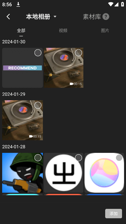 2、选择一个视频,可以选择本地相册中的素材,软件素材库中也有大量素材可以选择。