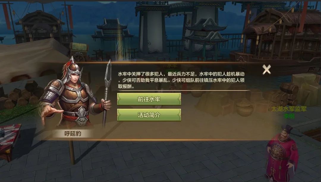 苏州水牢中关押了很多犯人,最近兵力不足,水牢中的犯人趁机暴动。少侠可组成 3~5 人小队前往苏州呼延豹处,镇压水牢中的犯人,领取胜利嘉奖~