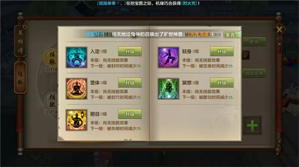 全新的经脉系统也推出了经脉技能~可以加强少侠对控制技能的防御能力哦,降低被控制技能的控制的时间。使用元神丹可获得经脉技能点数,可用于提升经脉技能的等级,元神丹可通过英雄试炼首通宝箱获得。此外少侠要是对自己的经脉技能不满意也可重置经脉加点,可通过元宝商城购买圆觉露,重置经脉技能的加点。