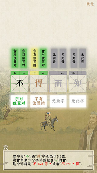 4、绿色表示音或字的位置对,黄色表示有但位置错,灰色表示没有。