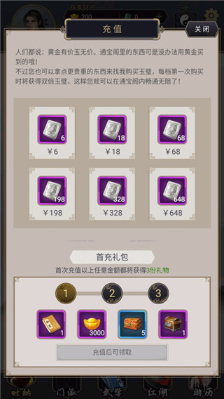 2、在设置——兑换礼包处输入兑换码“a666”,领取新手礼包(相马令*100、天山融雪丹*3、黄金5000、门派献礼*5)。在设置——江湖接引使处,输入本区某位大侠的接引令,可以在邮箱处领取3000黄金。