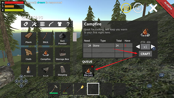 6、搭建完成后,可以在INVENTORY中看到一个营火图标,拖动这个图标到石斧等一行的那6个小框框中。