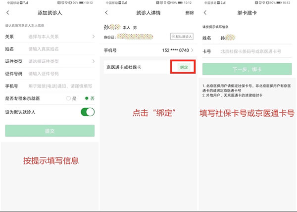 点击绑定按钮,来绑定京医通卡或北京社保卡卡号完成就诊人信息绑定。