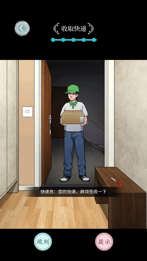 点门,在点击左边开关开灯,把剪刀拖到快递上,点击里面的纸条就可以通关了。