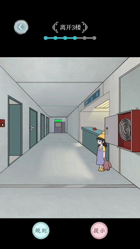 4、我们需要点击地上的纸条,打开右边的消防栓,移动到第一个门,然后点击左边墙上的按钮,前面的大门就会打开,点击进入到第五关卡当中。