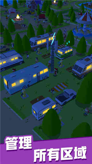 游戏中采用低模风格打造,画风简洁精美,内容简单有趣,操作轻松好上手。玩家化身露营地管理者,通过完成任务赢得奖励,改善设施、雇佣员工、设置盈利机制,扩大营地规模,为每位露营者提供愉快的住宿体验。同时,建设休闲娱乐区域和休息区域,将露营地打造成网红打卡点,吸引更多游客,增加收入,获得成长感和成就感。