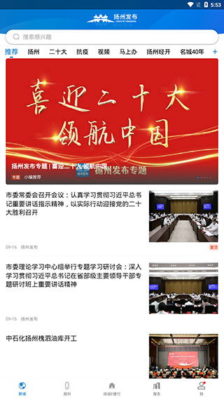 1、进入扬州发布app之后,我们就能在新闻页看到一些综合性的【新闻资讯】,但这并不是我们想浏览的最新通告。