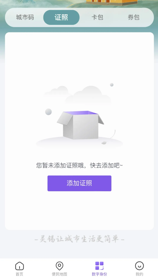 1、首页点击底部【数字身份】-【证照】-【添加】证照,完成证照添加。