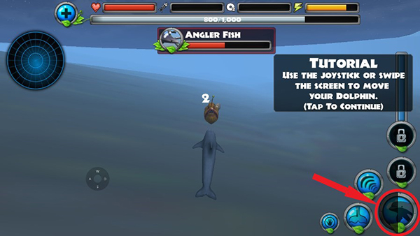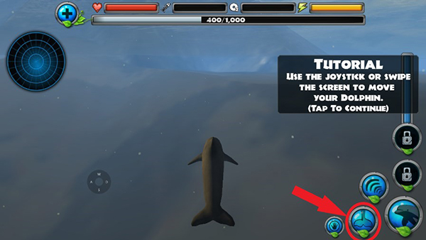 点击右下角尾巴图标,可以摆动海豚尾巴,前进加速。