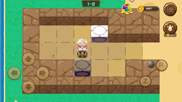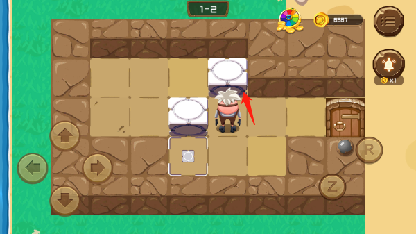 1、在本站点击开始游戏。进入第一个关卡门,你会发现你被锁在这个方块屋里了,此时你要做的是用你的聪明才智把一个石头方块推入到机关标识的地方才能把门打开,游戏界面左边的四个箭头是控制方向的,右边的R是返回到原点的按钮,z是返回上一格。